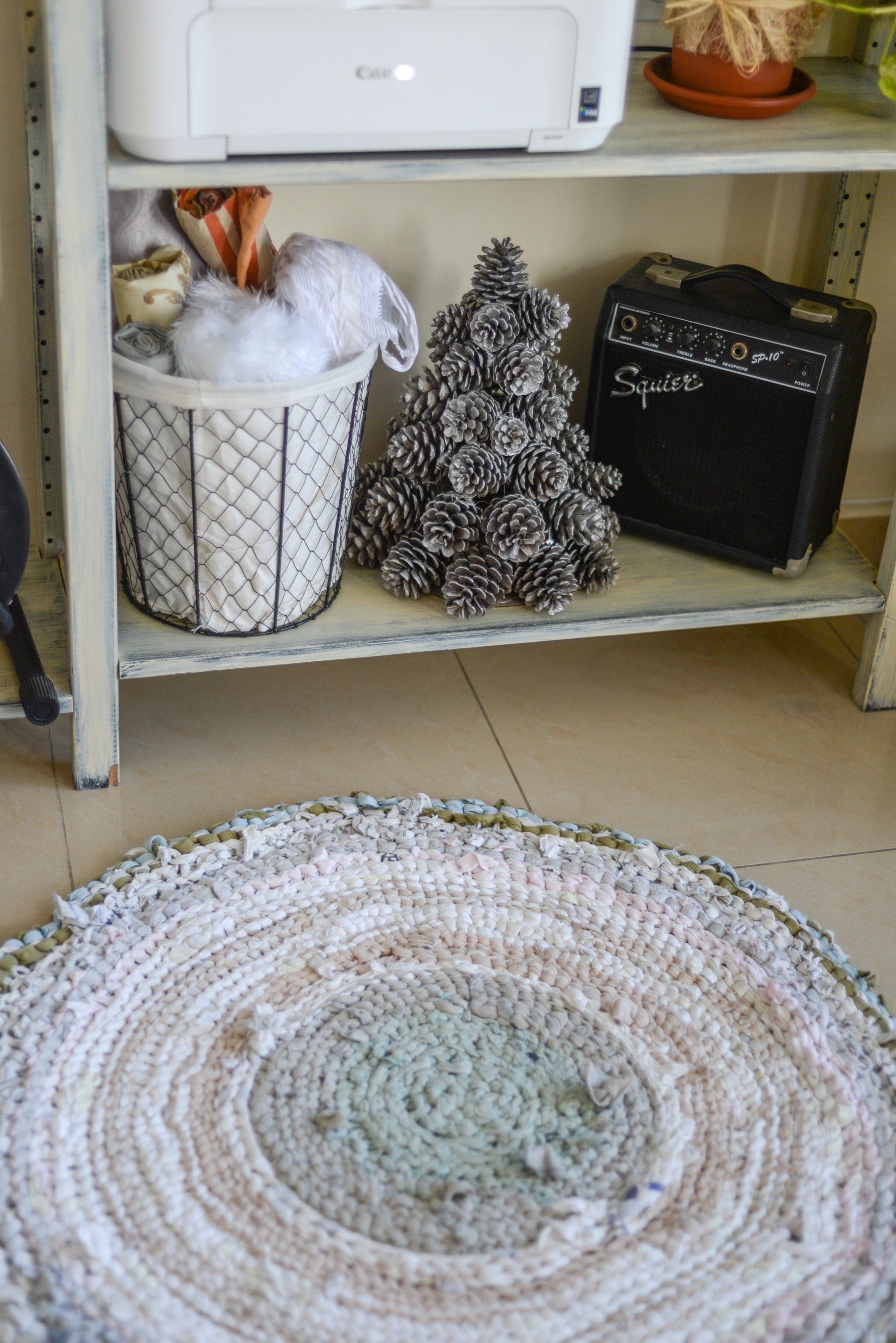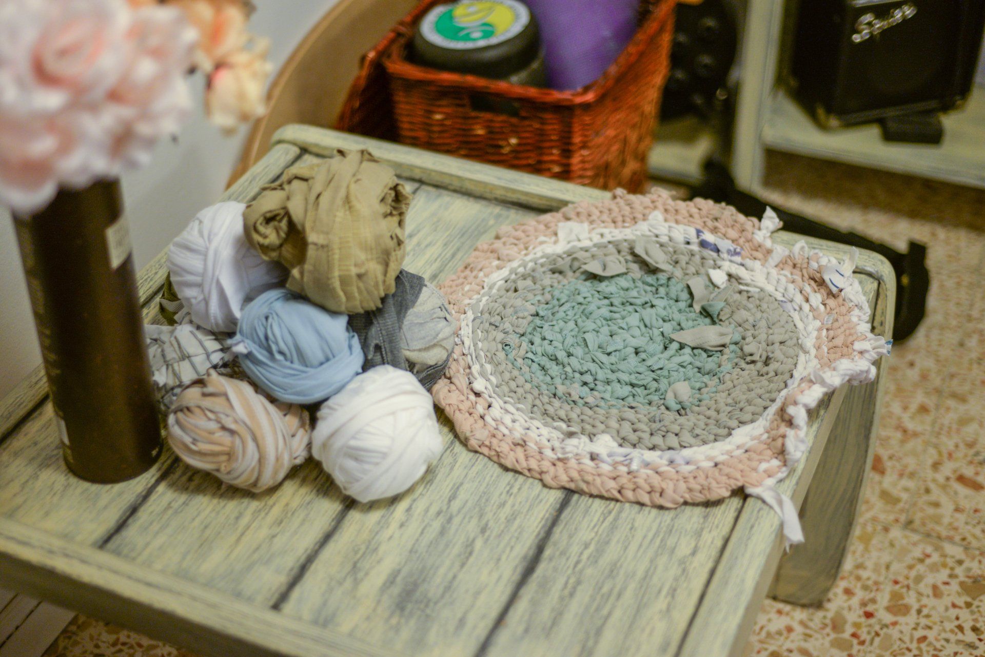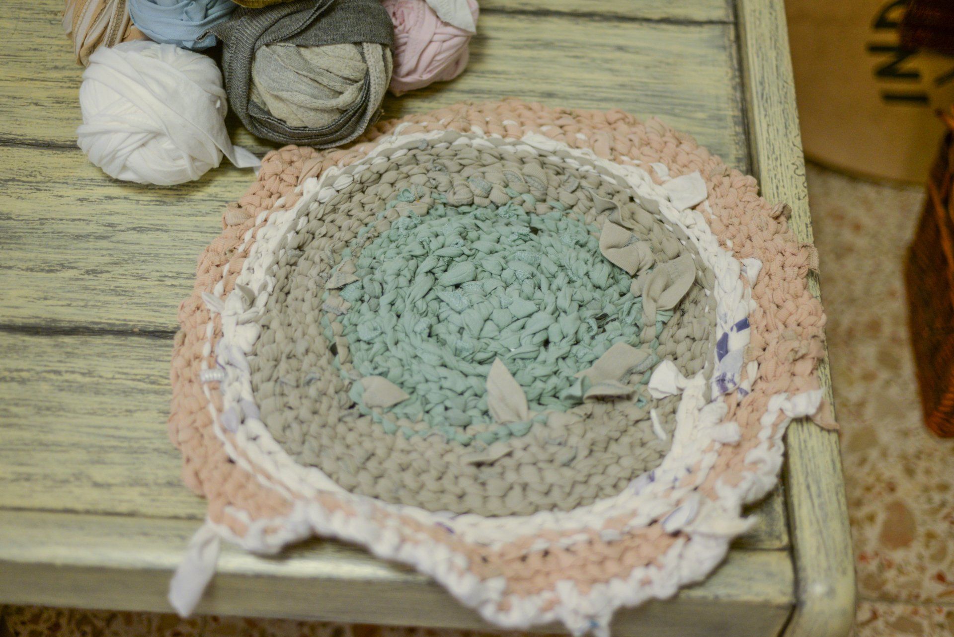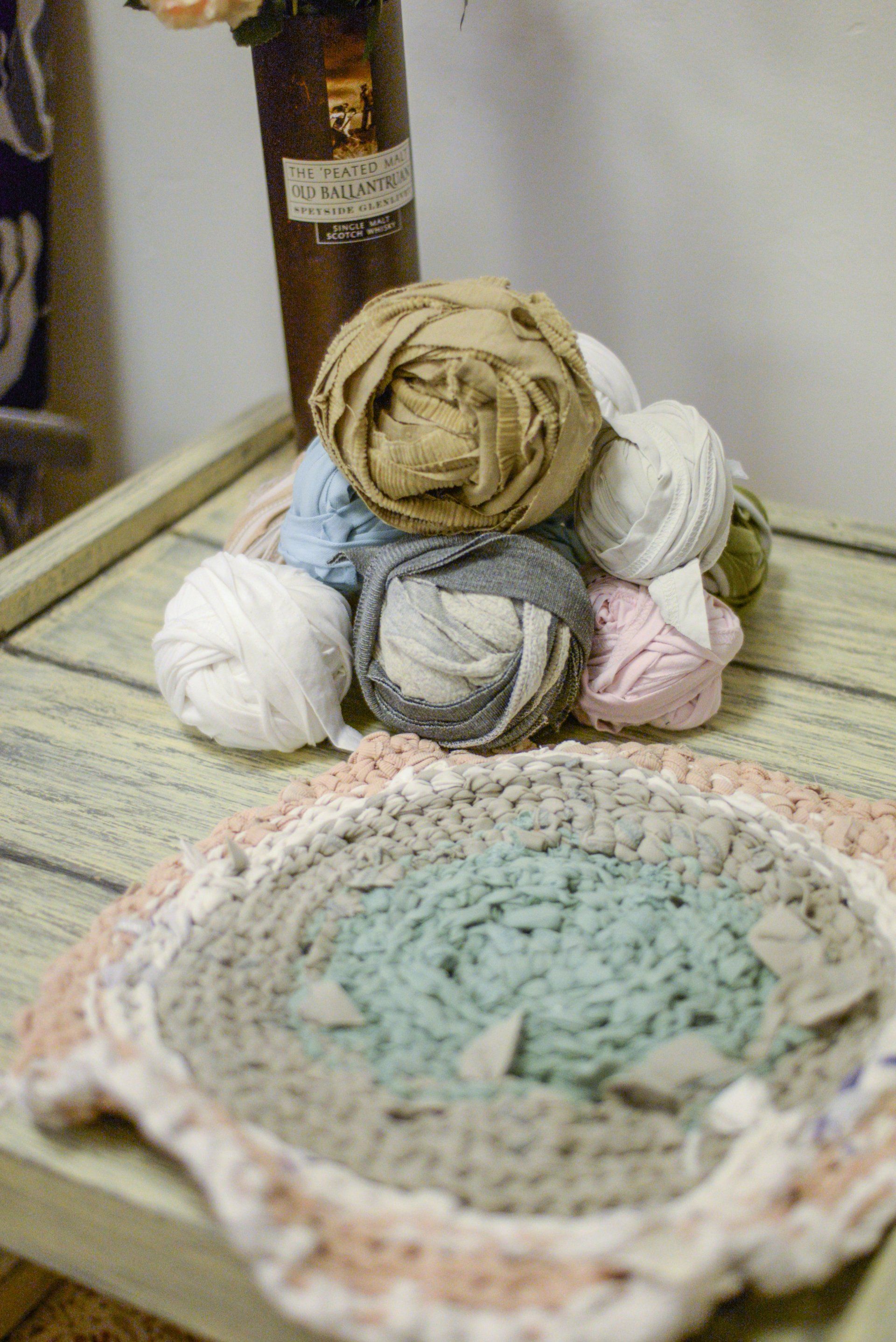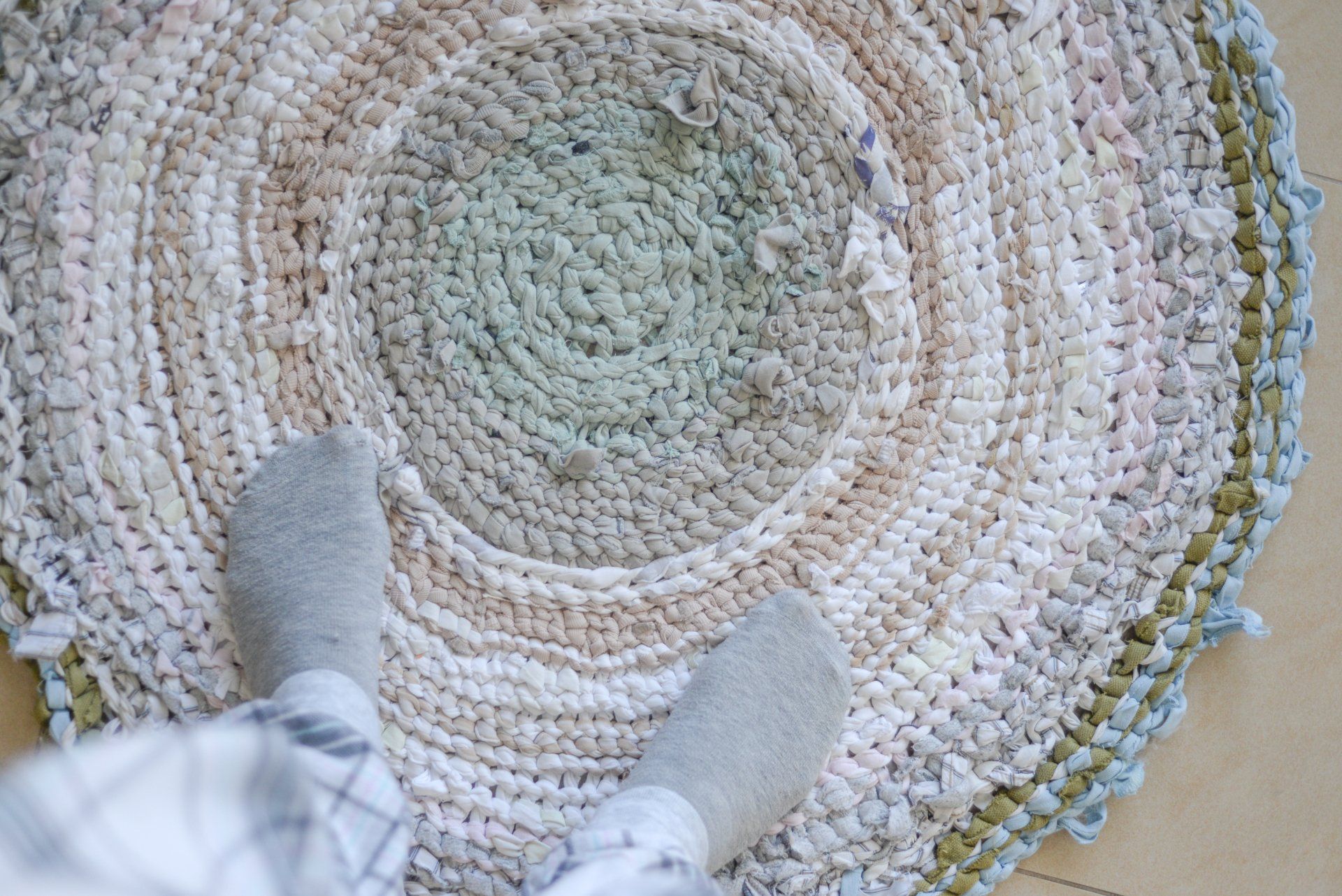 I picked a few light colored ones, cut them to long stripes and knitted a small round rug, inspired by the rugs my grandma had in her house.