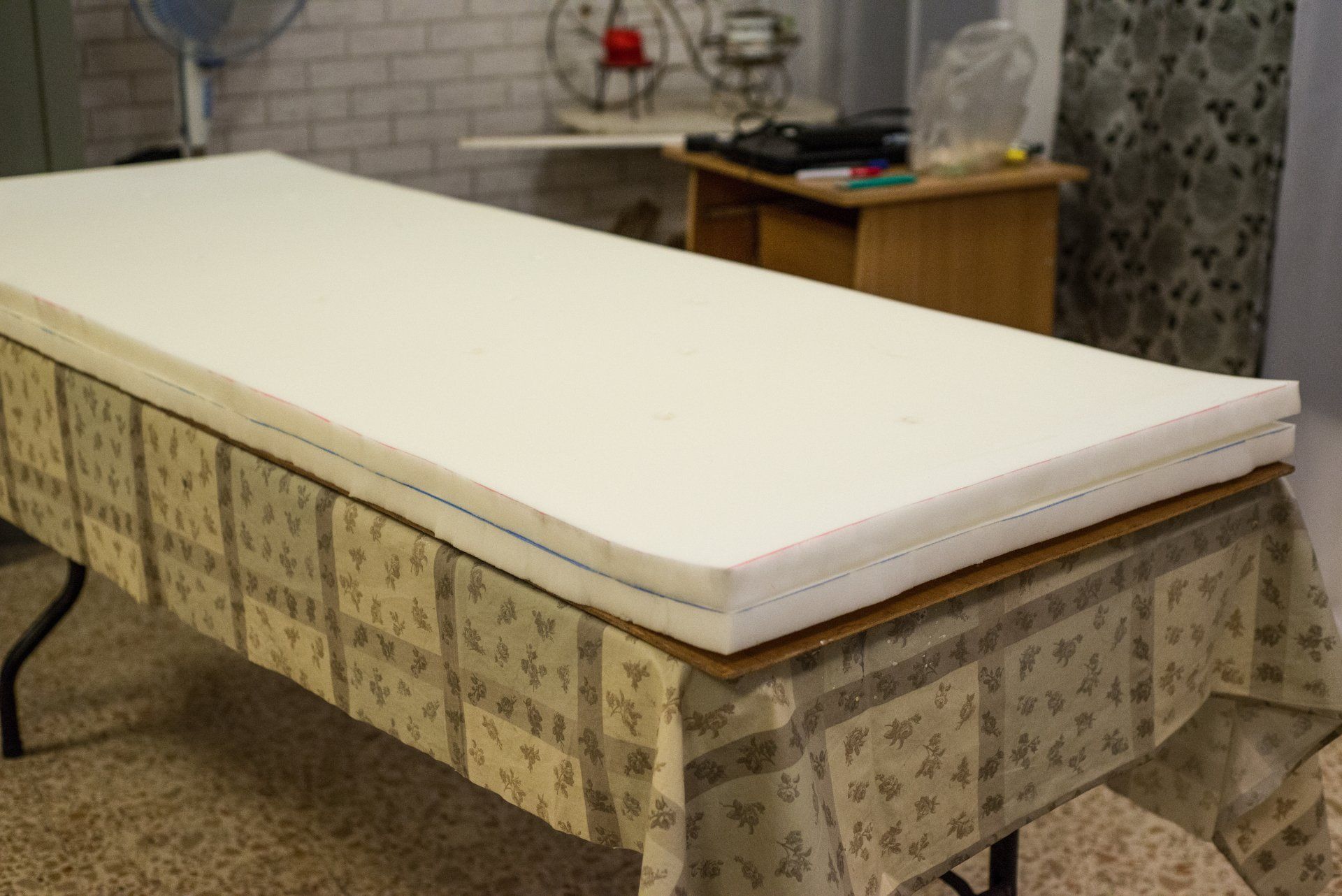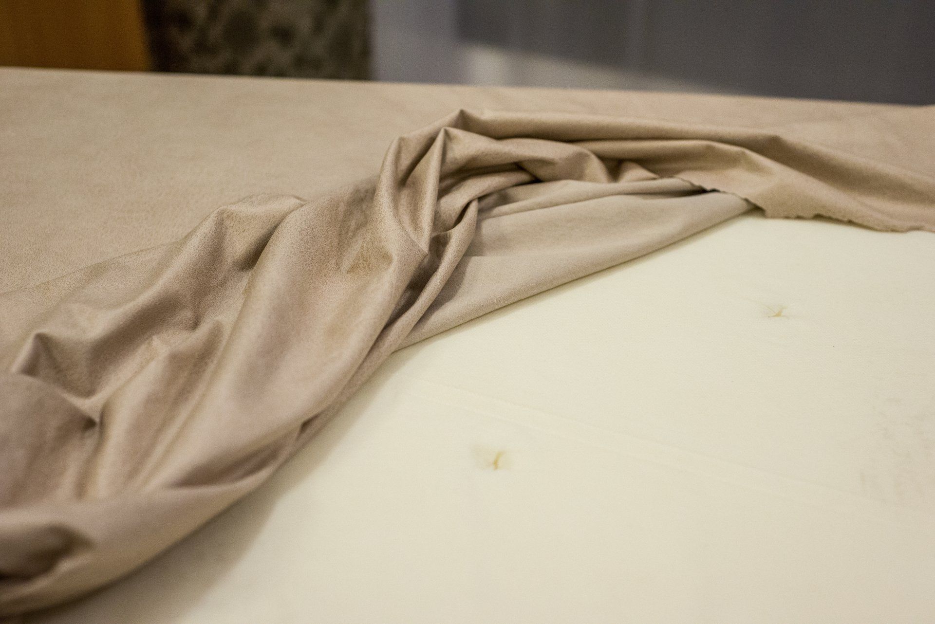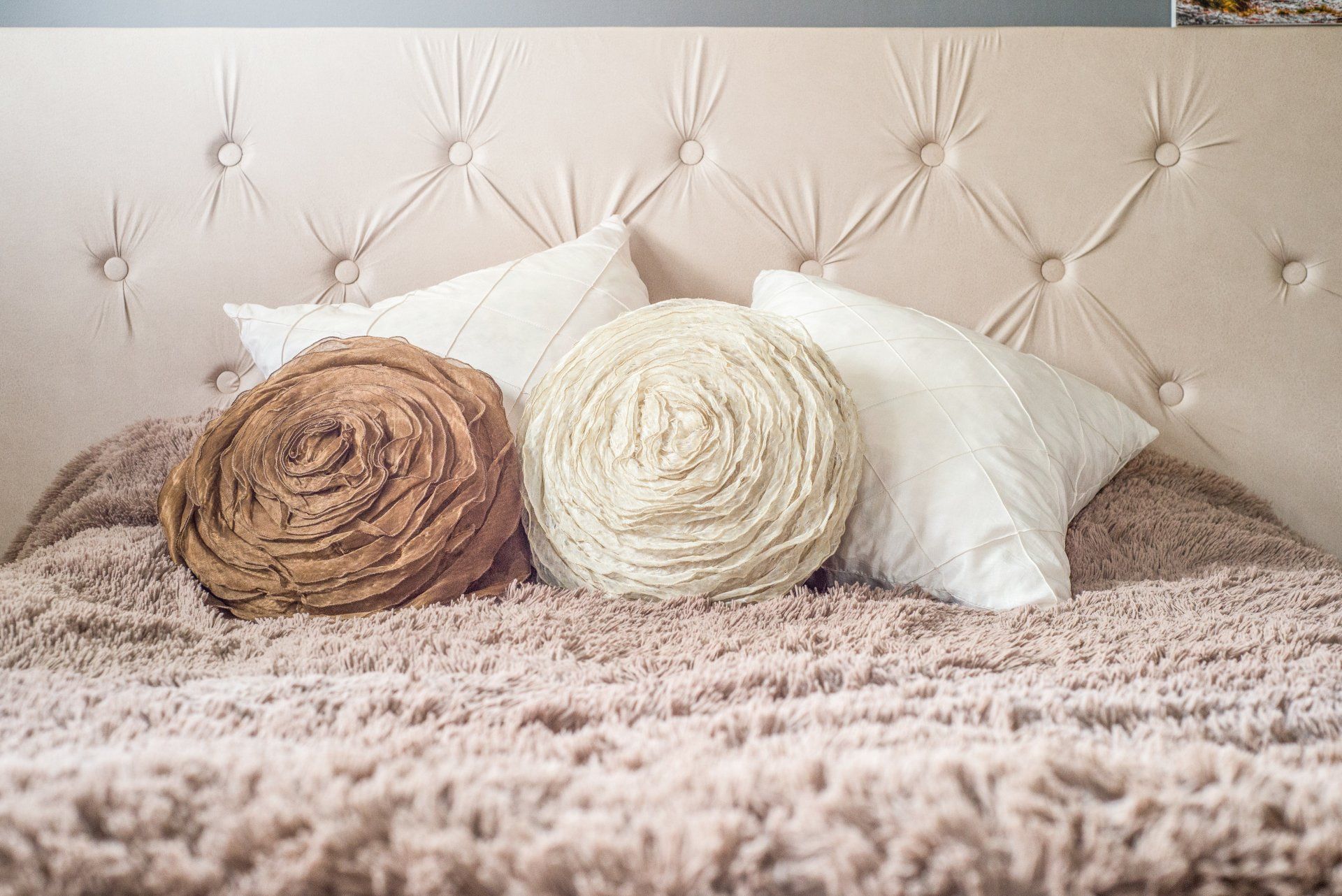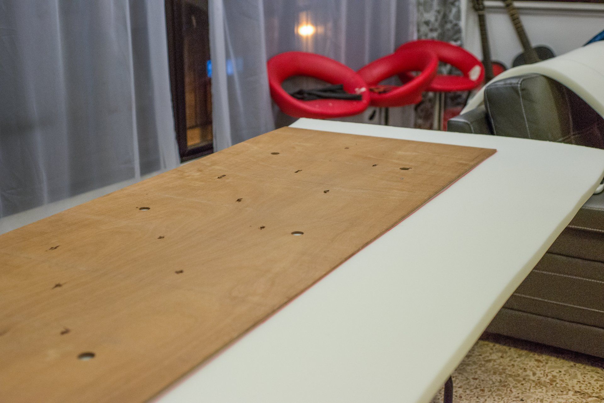 My first time making a tufted headboard. For simplicity, I hung it on a wall instead to actually attaching it to the bed frame.