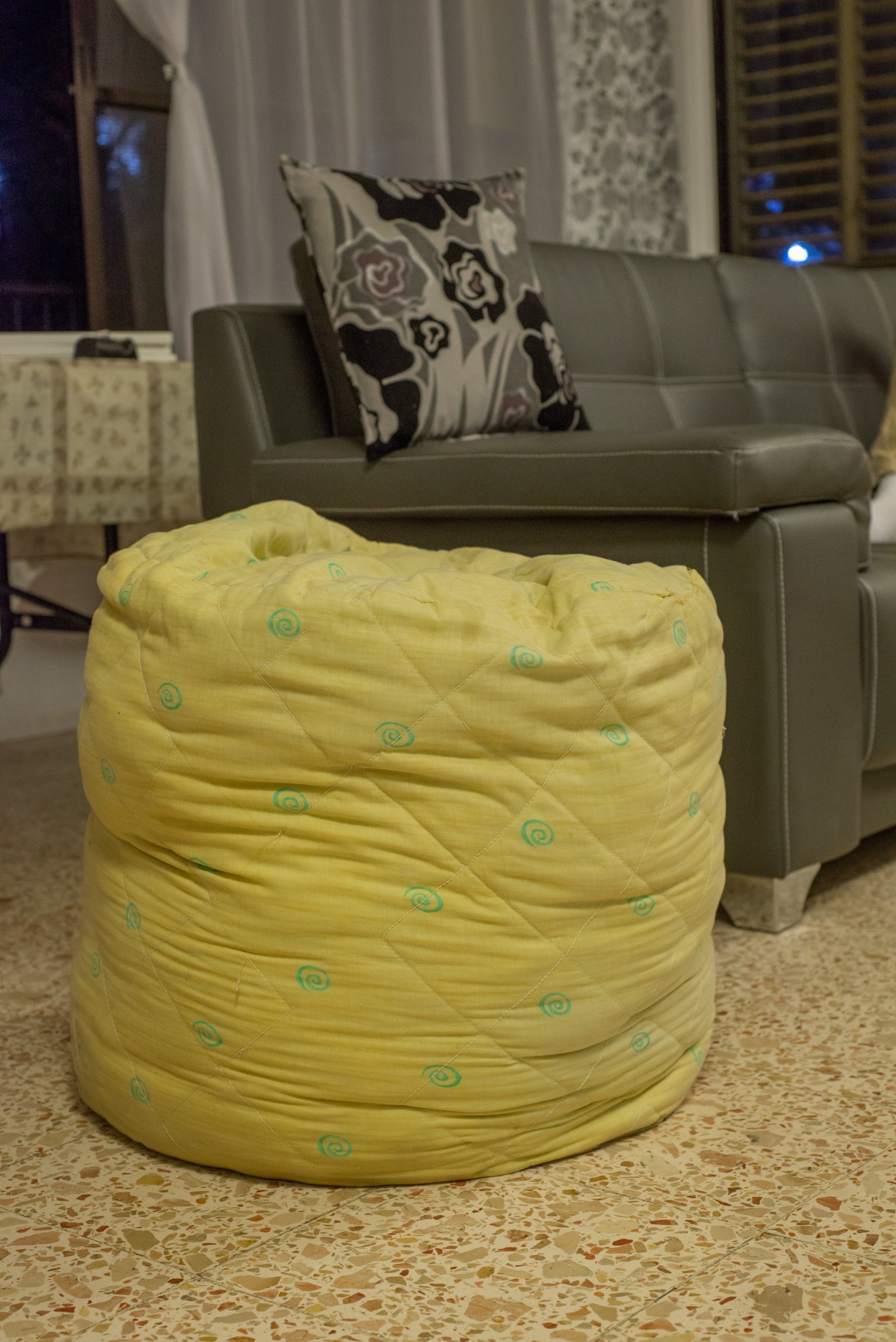 I made this ottoman of an old bed cover filled with old clothes, many years ago. At some point I aknowledged how ugly the yellow fabric is and decided to sew it a cover. It was the very beginning of my "adult" DIY jorney! I remember Stephan'sreaction of amazement when he saw the transformation. Nothing motivates more than when your partner admires you :)